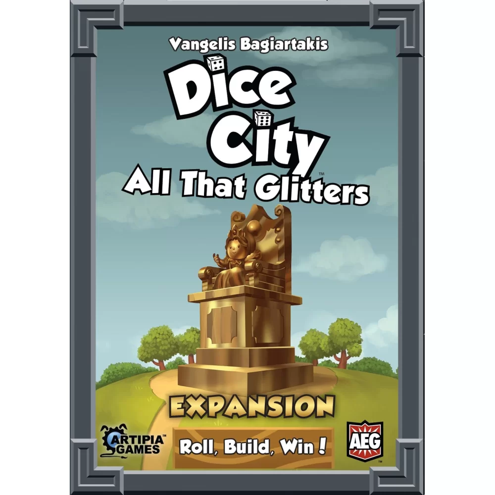 Dice City: All That Glitters includes three new locations of each type — military, economic, cultural and civic — as well as a new location available throughout the game: the Gold Mine, a Commodity location. This expansion also comes with a supply of gold tokens with which to play.