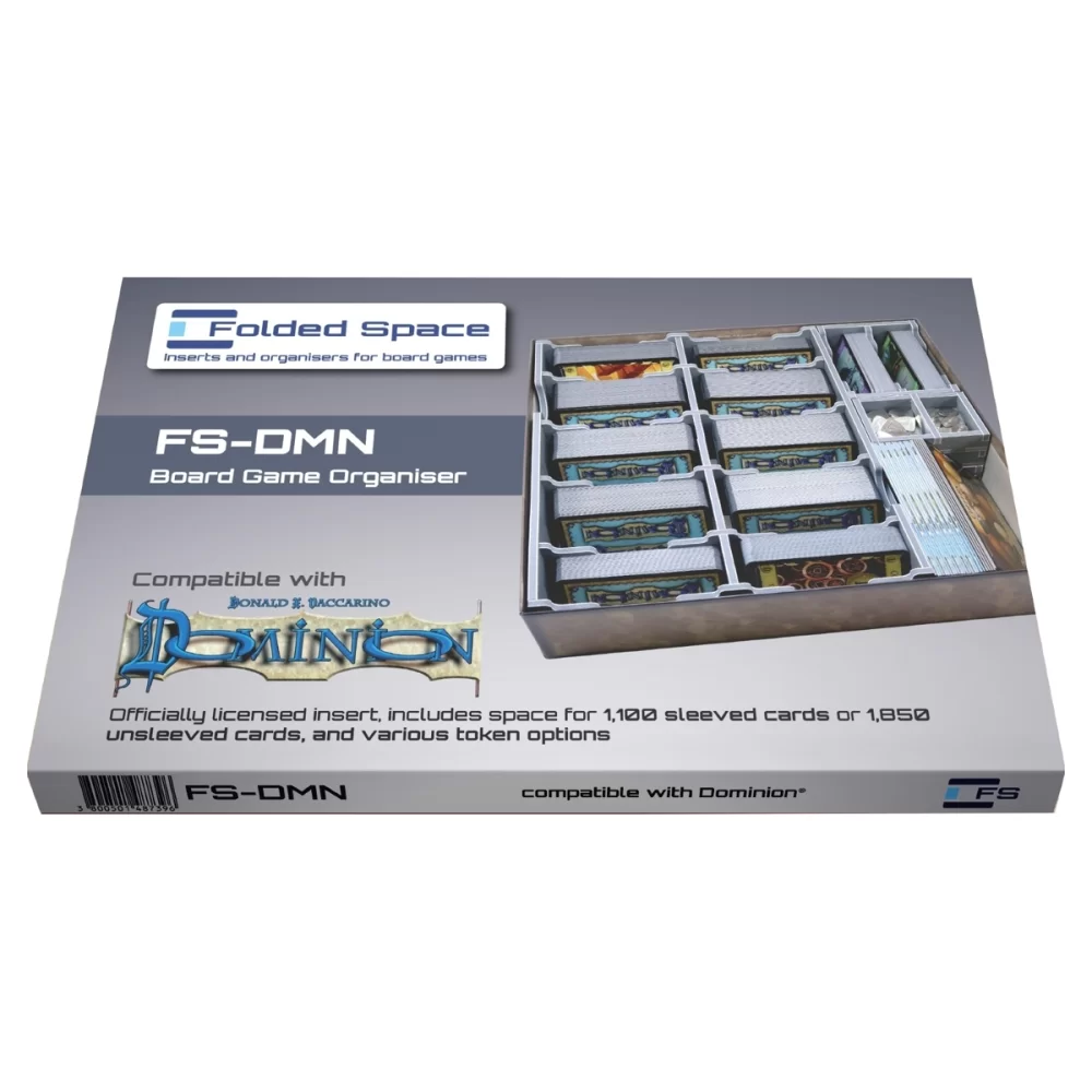 Official insert compatible with Dominion®, with space for  1,100 sleeved or 1,850 unsleeved cards. The design provides both efficient storage and improved game play, with removable token trays for use during the game. The rule books act as a lid on top of the trays.