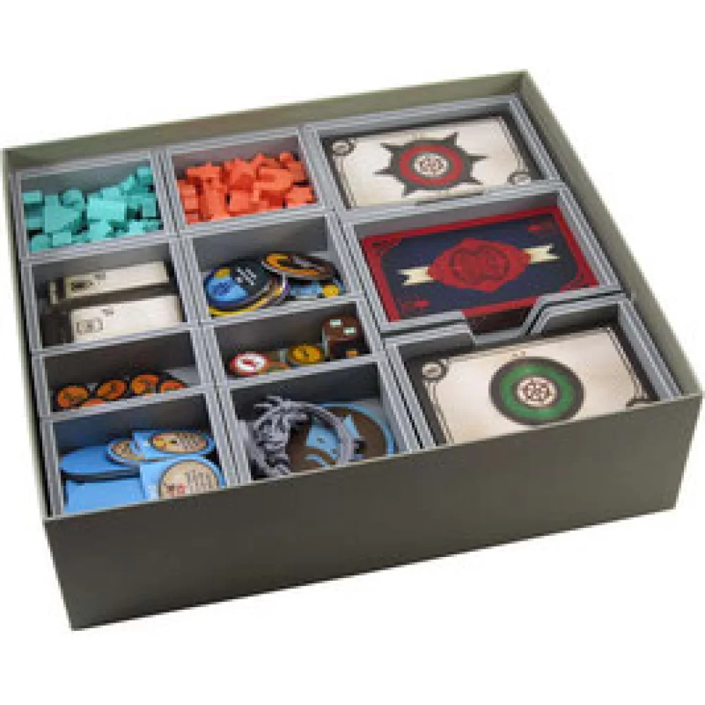 Insert compatible with Scythe Fenris®, the Wind Gambit® and Scythe Encounters® expansions. The design provides both efficient storage and improved game play. The trays can be utilised during the game, and they greatly aid set-up and clear-away times. The rules and boards act as a lid on top of the trays.