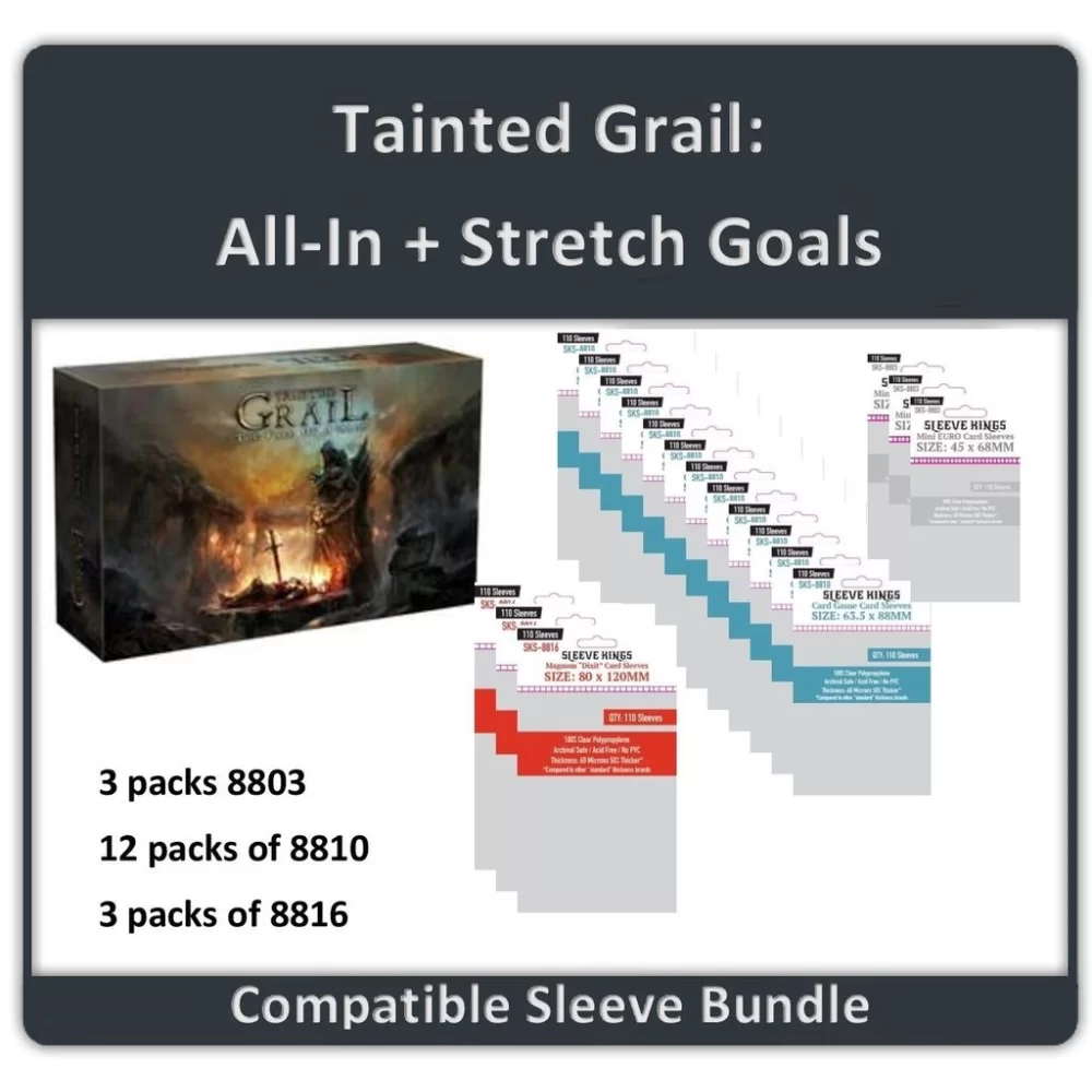These are all the sleeves you need to sleeve everything in Tainted Grail All In/Stretch Goal. See images for details.